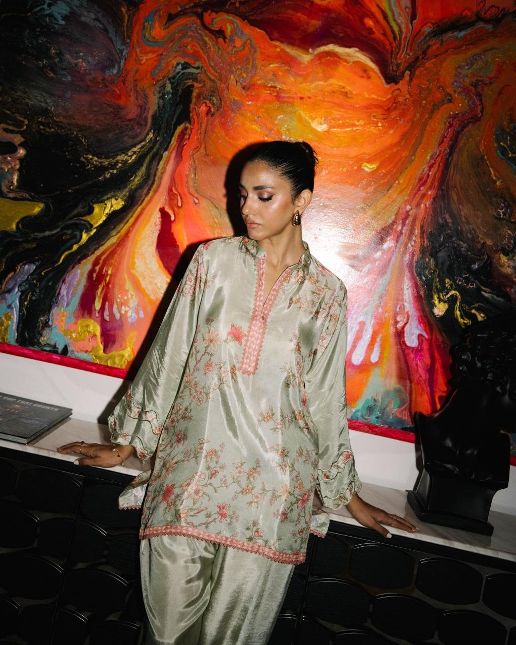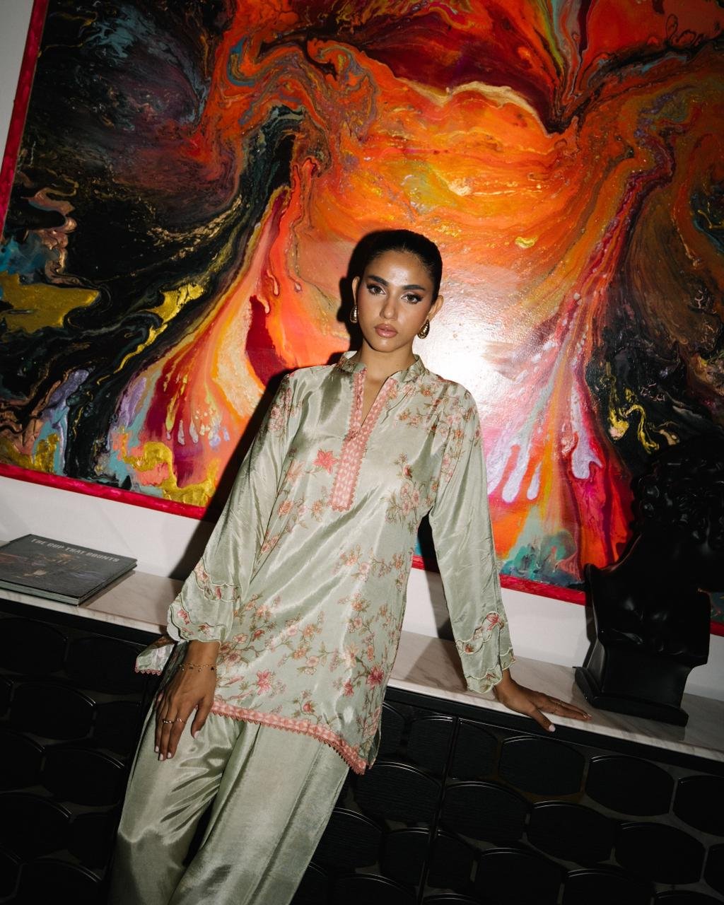 pure silk set in a serene sage hue, detailed with soft floral patterns and finished with contrast lace trims. Fabric: In house pure silk Price: 9500