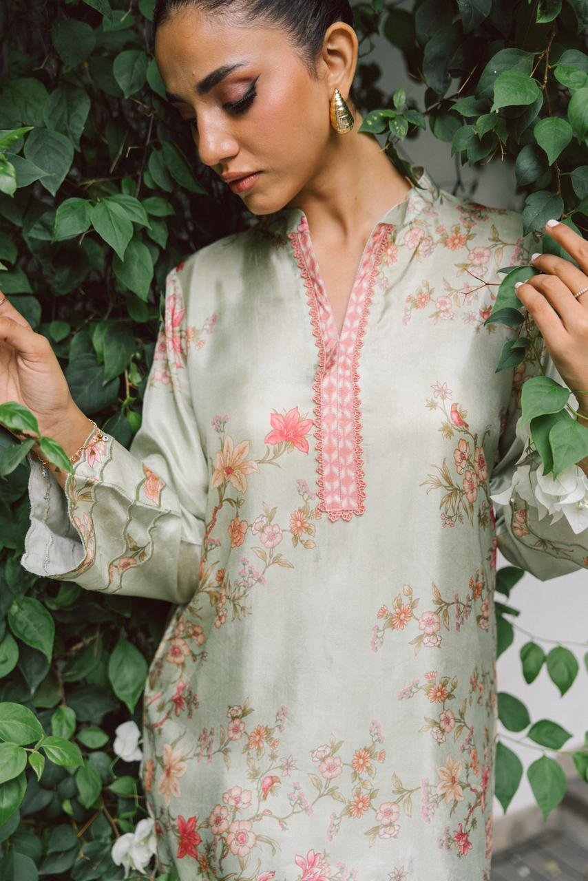 pure silk set in a serene sage hue, detailed with soft floral patterns and finished with contrast lace trims. Fabric: In house pure silk